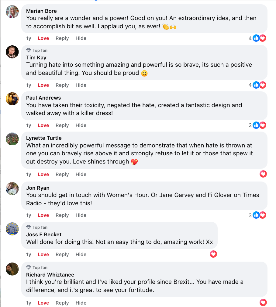 Following multiple requests on social media and dialogue with friends and supporters, I have decided to create a "Love Dress" to follow on from the "Hate Dress".